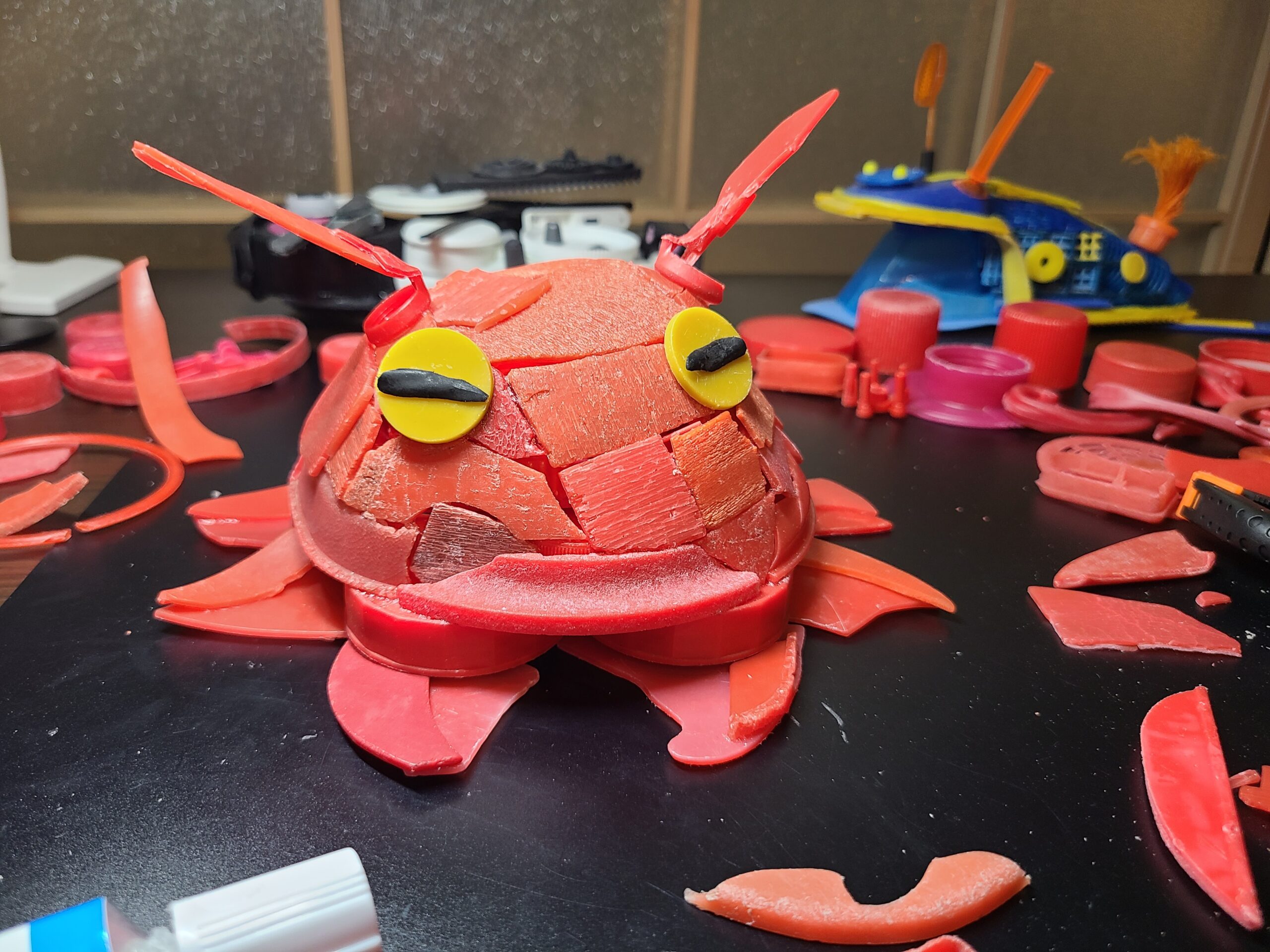 耳(ヒレ)の接続部に、調味料の内栓を使用したので、お耳がパタパタします。